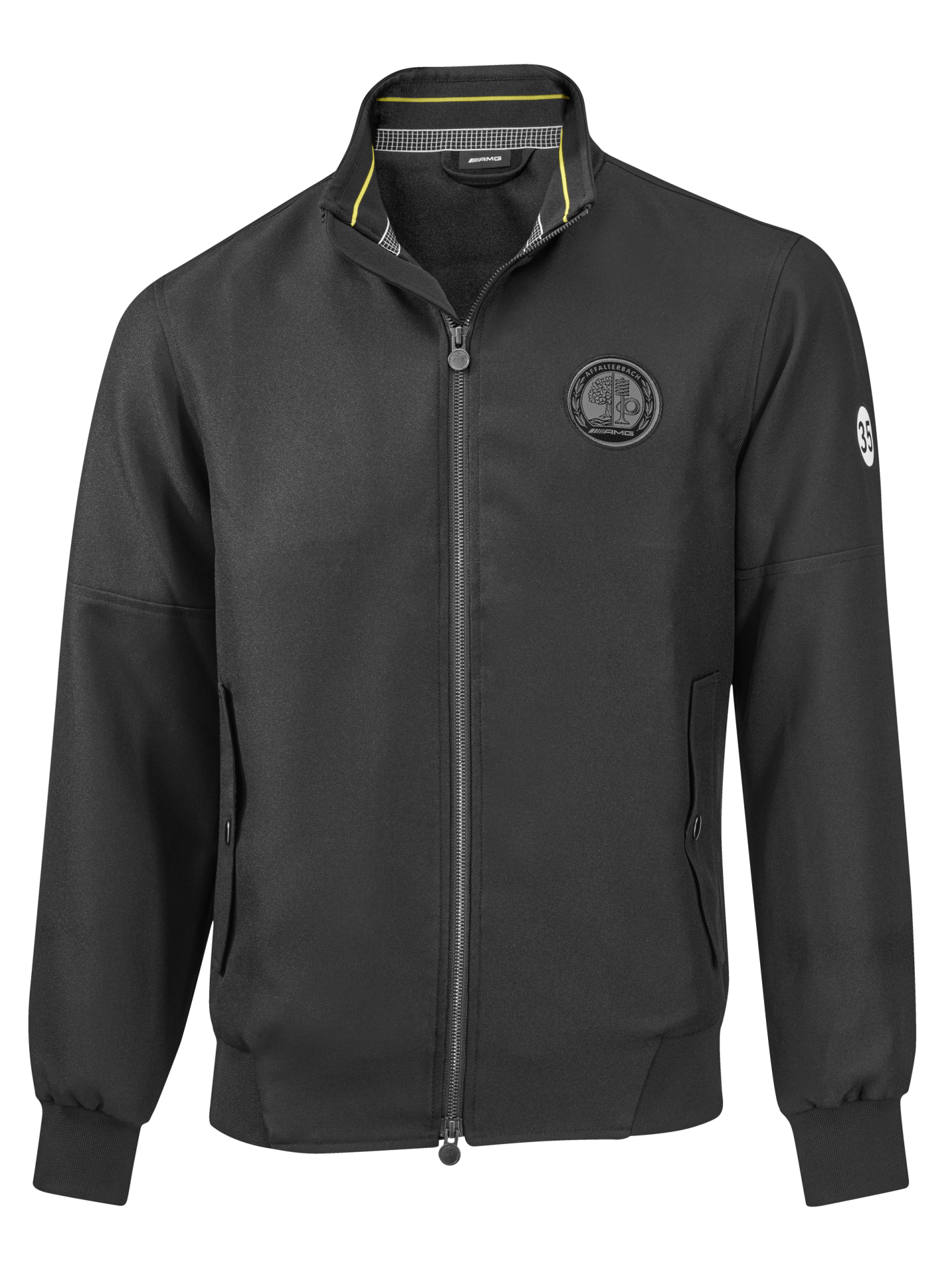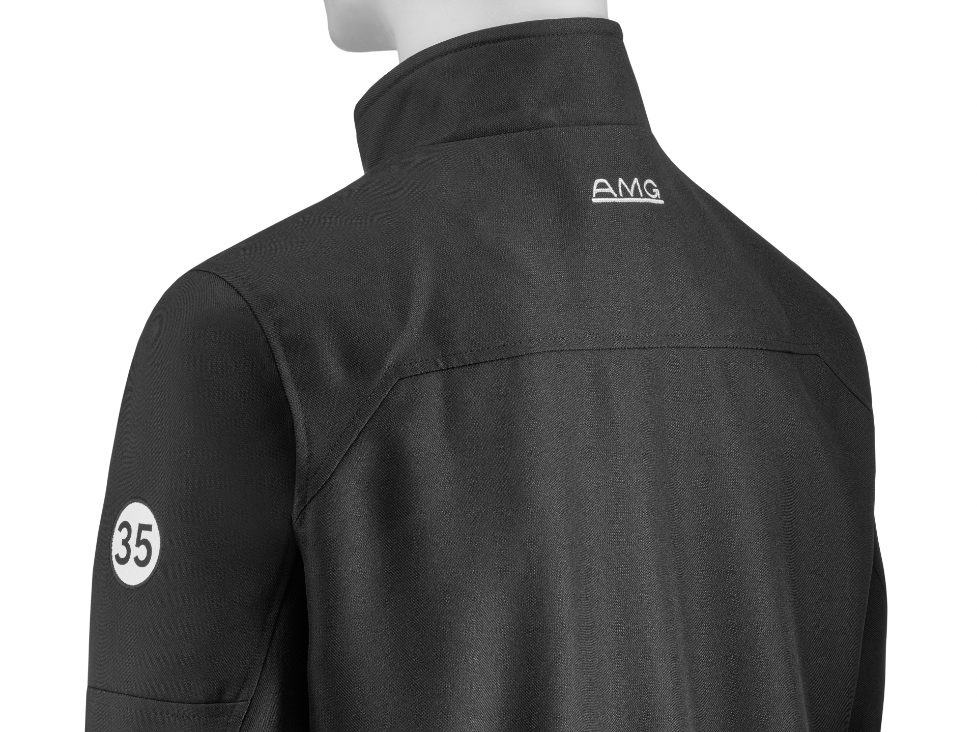 Na lewej piersi tkana naszywka z logo AMG oraz na lewym rękawie numer startowy „35” w kontrastowej, białej oprawie.
