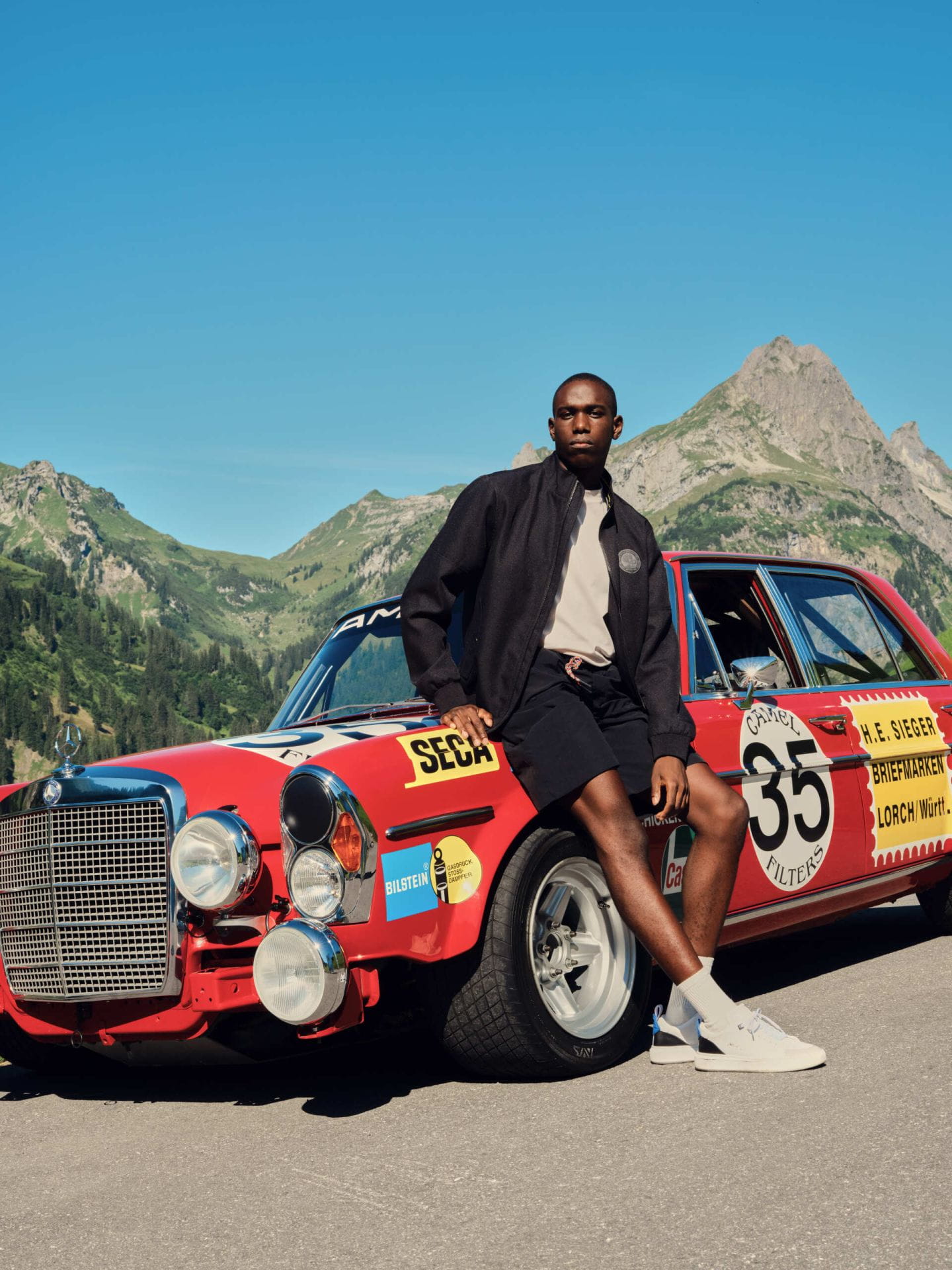 Detale: tkane logo AMG, srebrne haftowane litery „AMG vintage”, numer startowy 35