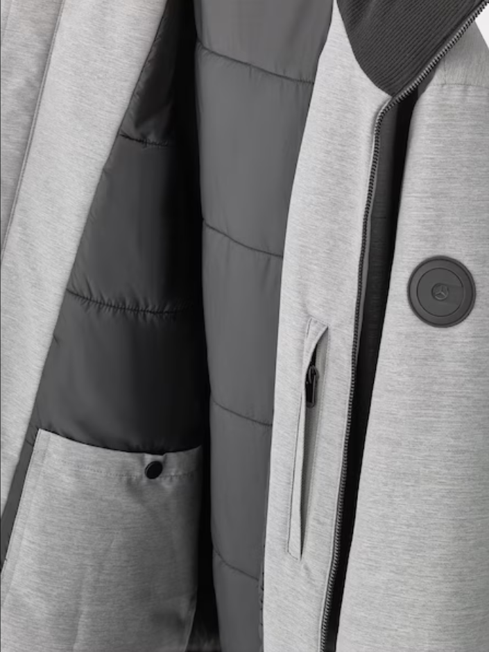 Wyjątkowy design: tonalny haft z gwiazdą Mercedesa, silikonowa naszywka G-Class na rękawie oraz suwak z gwiazdą 3D – subtelne, ale wyraziste detale dla prawdziwych koneserów