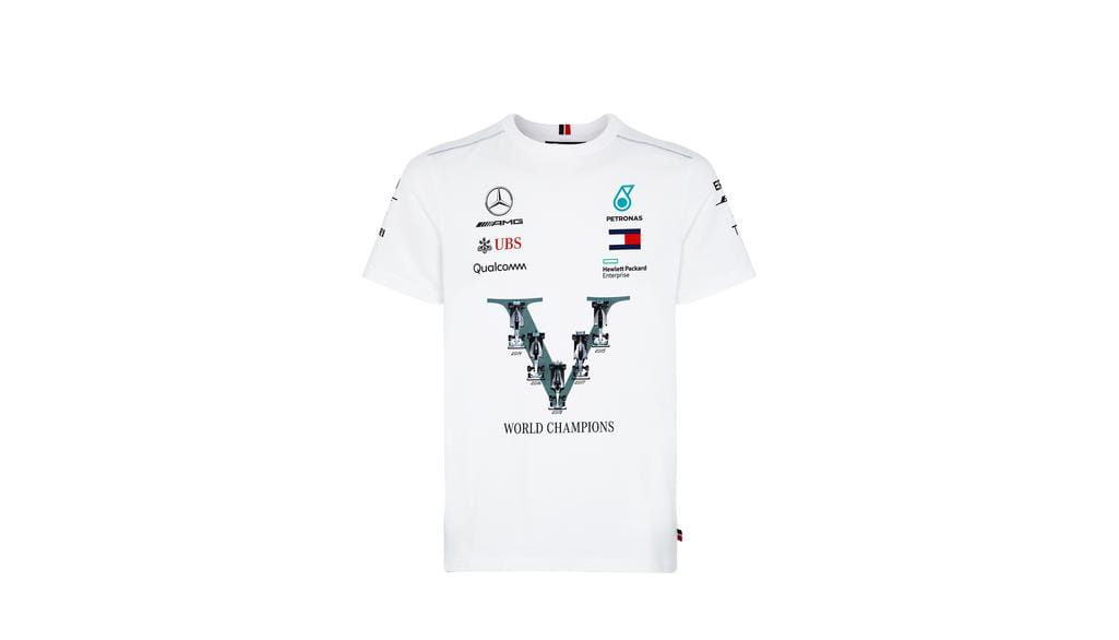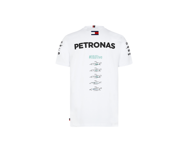 Samo spojrzenie na tę białą koszulkę nie pozostawi w umyśle obserwatora wątpliwości co do tego, który zespół F1 sprawi, że serce użytkownika zabije szybciej. Nadruk „Mistrzowie Świata”, zwycięskie lata 2014, 2015, 2016, 2017 i 2018 oraz nadruk „#HiFive” na oficjalnej koszulce wyraźnie pokazują, kto zwyciężył w tych wyścigach. Nadrukowane logo Mercedes-Benz i Petronas, w połączeniu z różnymi logami sponsorów i wzorem Srebrnych Strzał sprawiają, że ta koszulka jest numerem 1 wśród fanów sportów motorowych.